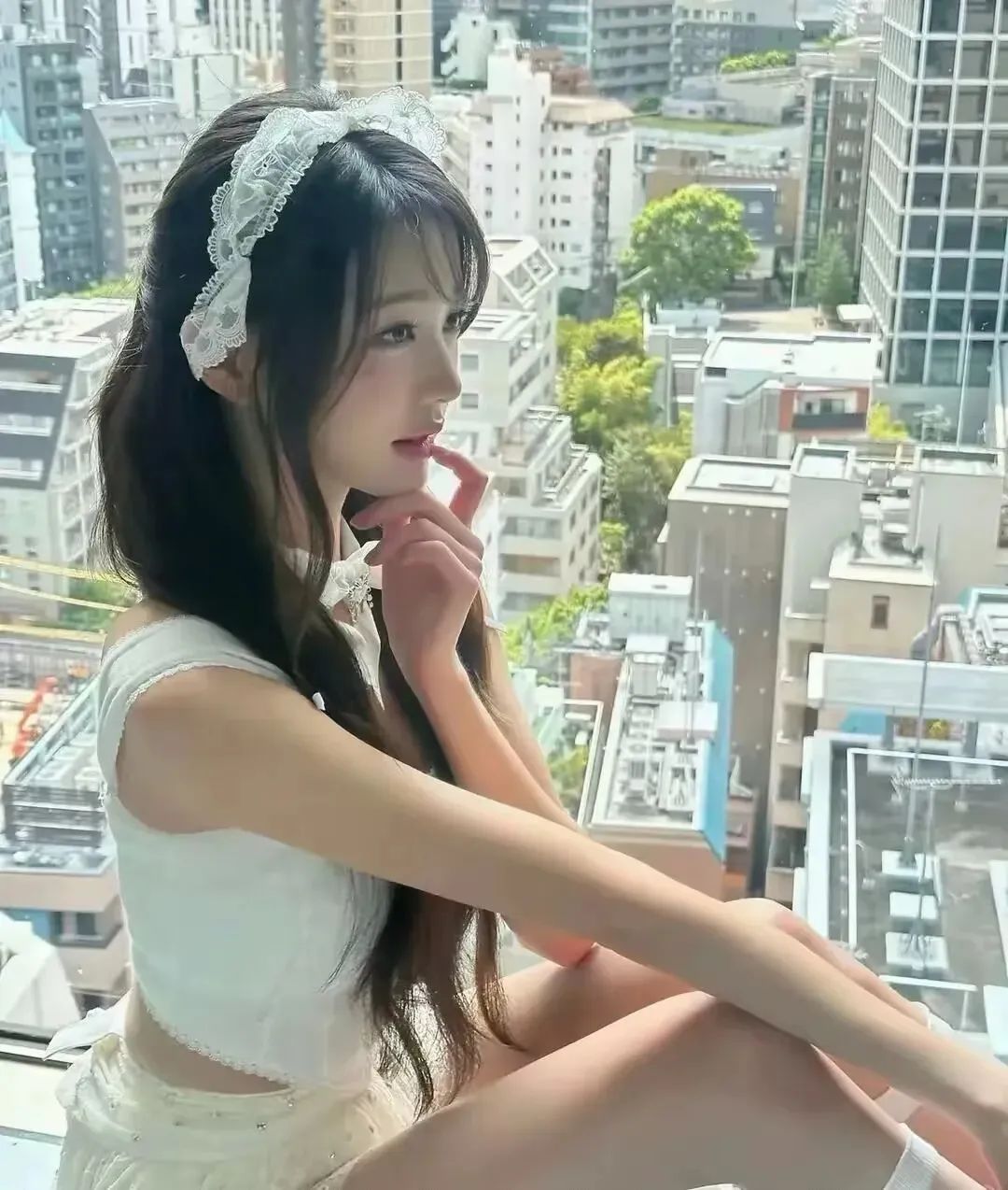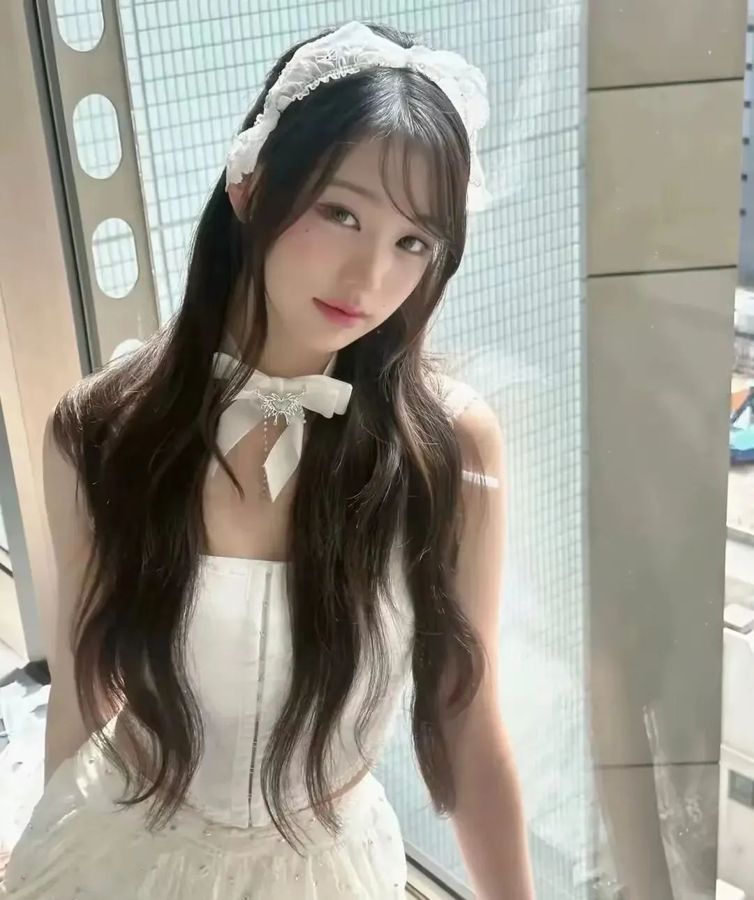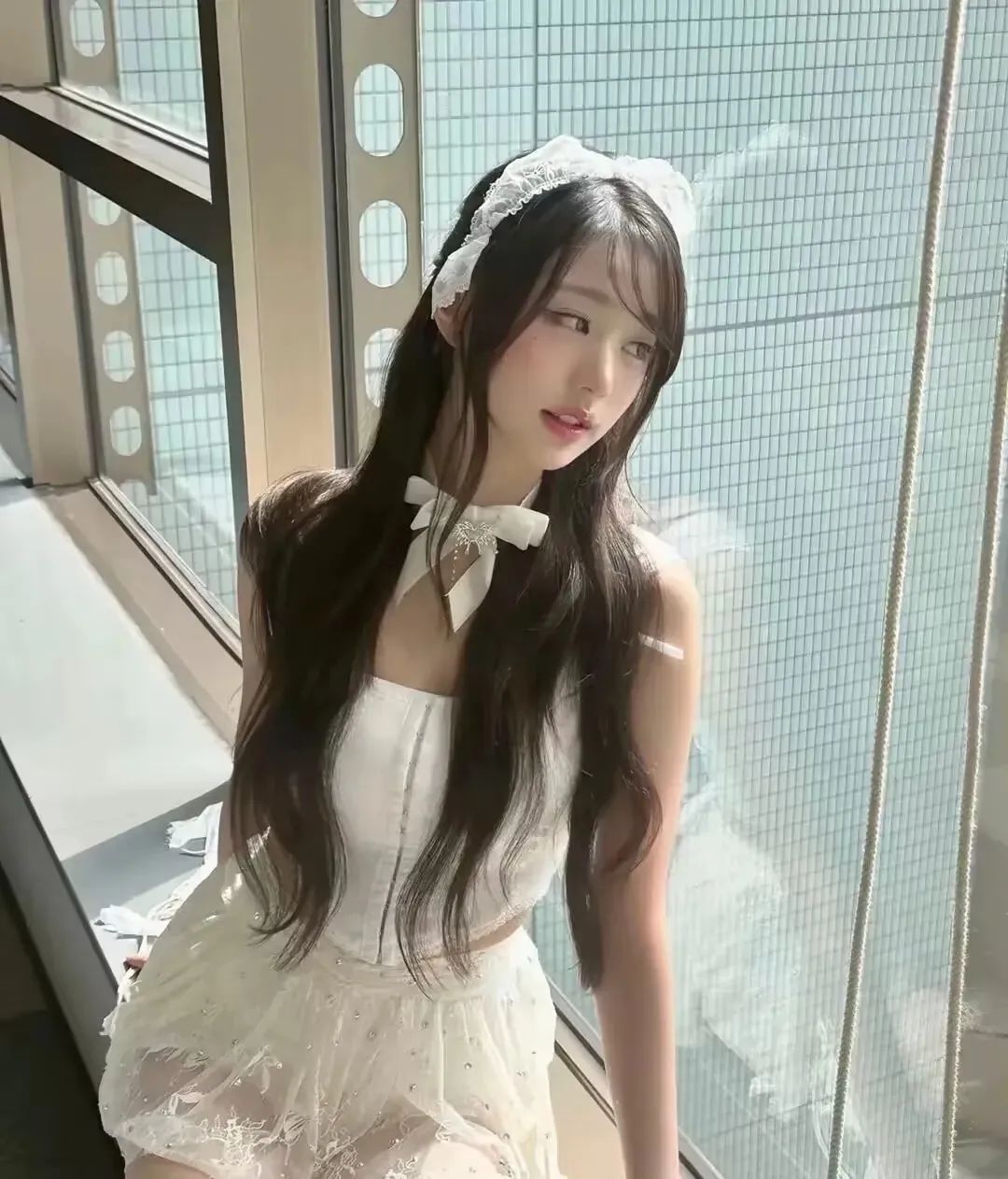 而她那一头长发垂至腰际,只用一根同款蕾丝带轻轻绑住,飘逸感拉满。风一吹,就像仙女刚从云端走下凡间。她脖子上的那根蕾丝细带装饰,更是点睛之笔,低调却撩人,散发出浓浓法式浪漫气息。