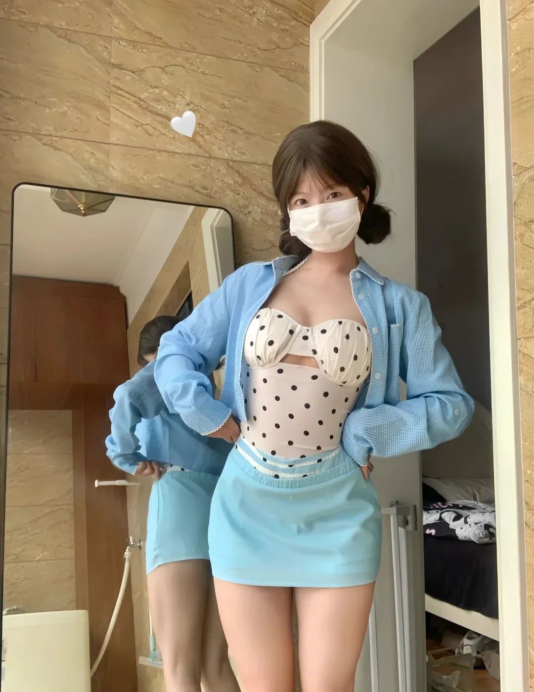 对镜自拍壁纸,波点上衣+蓝色短裙,俏皮时尚