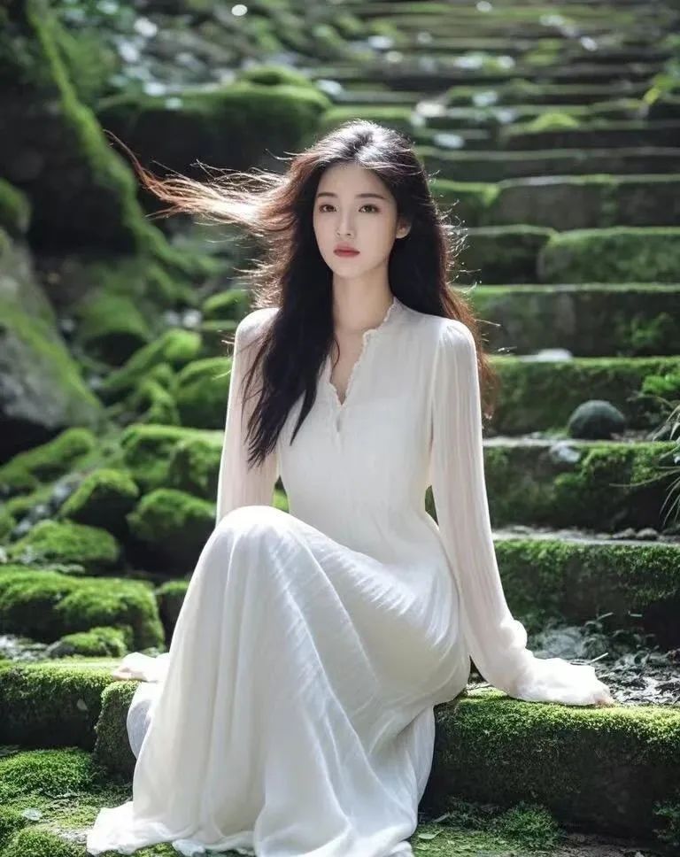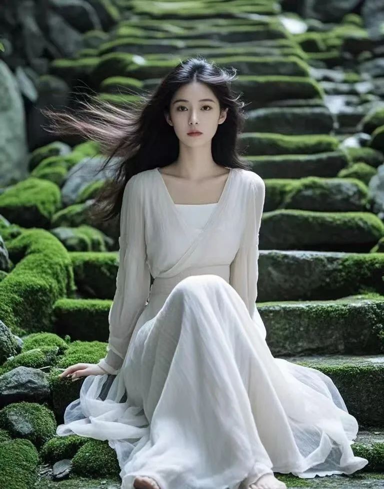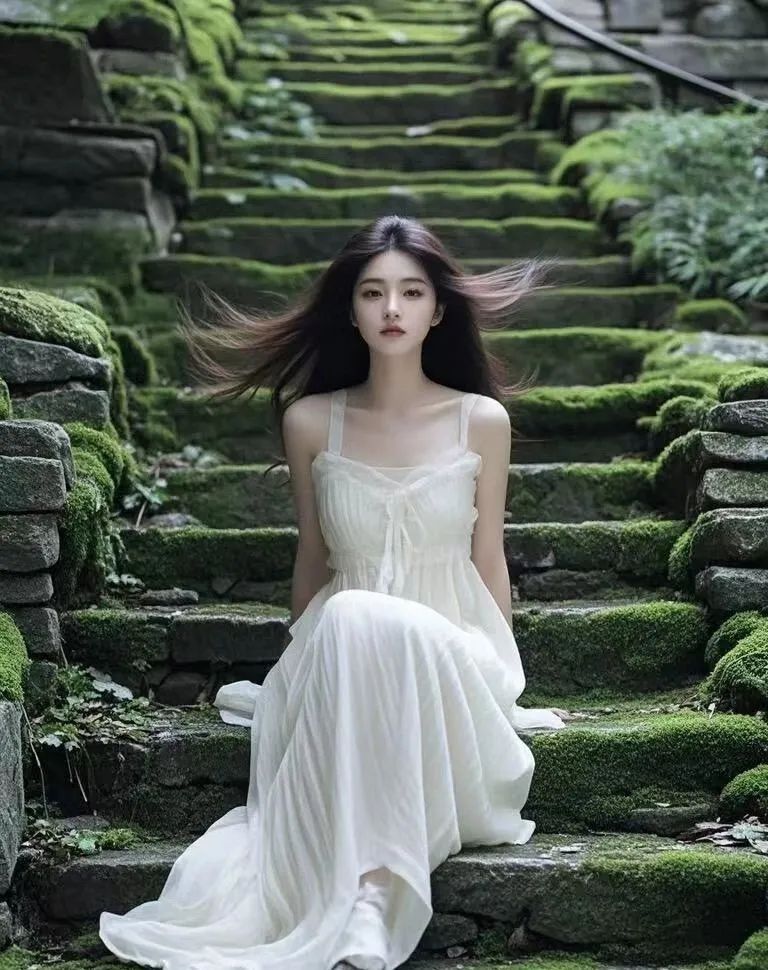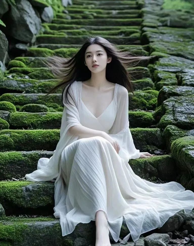 青苔的绿意与女子的宁静相得益彰,让人不禁想起那些被遗忘的美好时光。在这里,没有喧嚣,没有纷扰,只有内心的宁静与平和。
