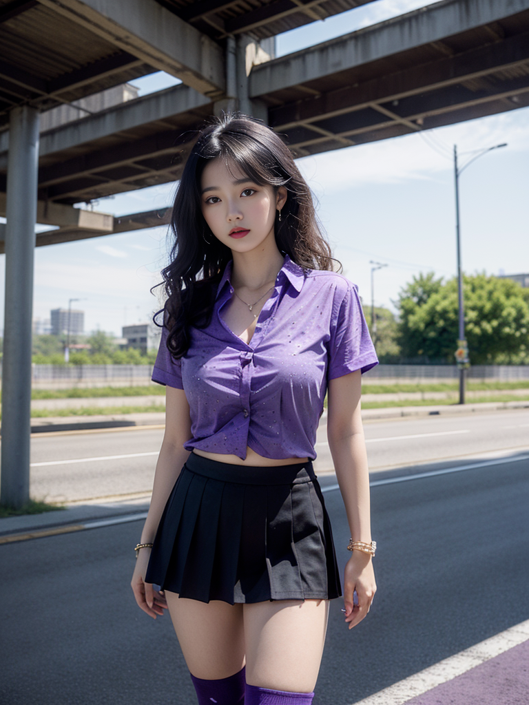 紫色衬衫搭配黑色小短裙,简单又不俗气,少女感十足,颜值与身材并存的小姐姐。