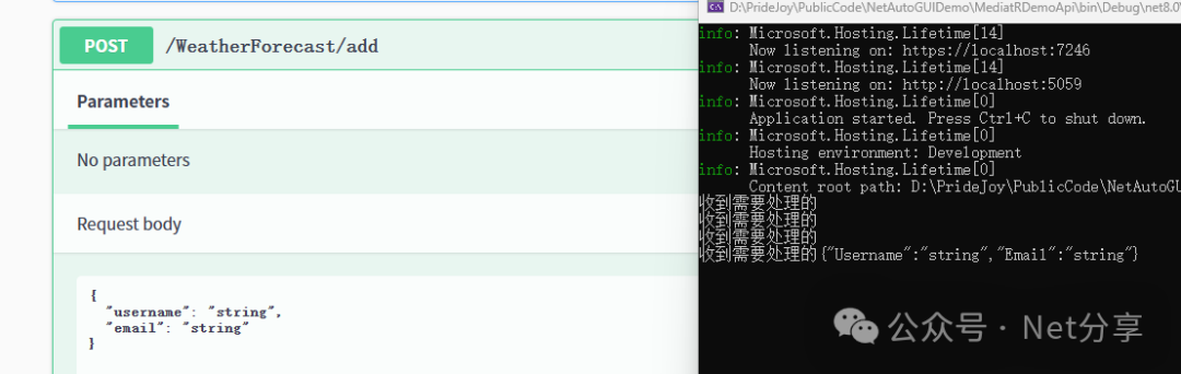 // 处理程序类 using MediatR;using MediatRDemoApi;using Newtonsoft.Json;publicclassAddUserCommandHandler : IRequestHandlerAddUserCommand, bool>{ //private readonly IUserRepository _userRepository; //public AddUserCommandHandler(IUserRepository userRepository) //{ // _userRepository = userRepository; //} public async Taskbool> Handle(AddUserCommand request, CancellationToken cancellationToken) { Console.WriteLine("收到需要处理的" + JsonConvert.SerializeObject(request)); //var user = new User(request.Username, request.Email); //return await _userRepository.AddUserAsync(user); //模拟添加成功,返回true returntrue; }}3.在服务或控制器中发送命令: