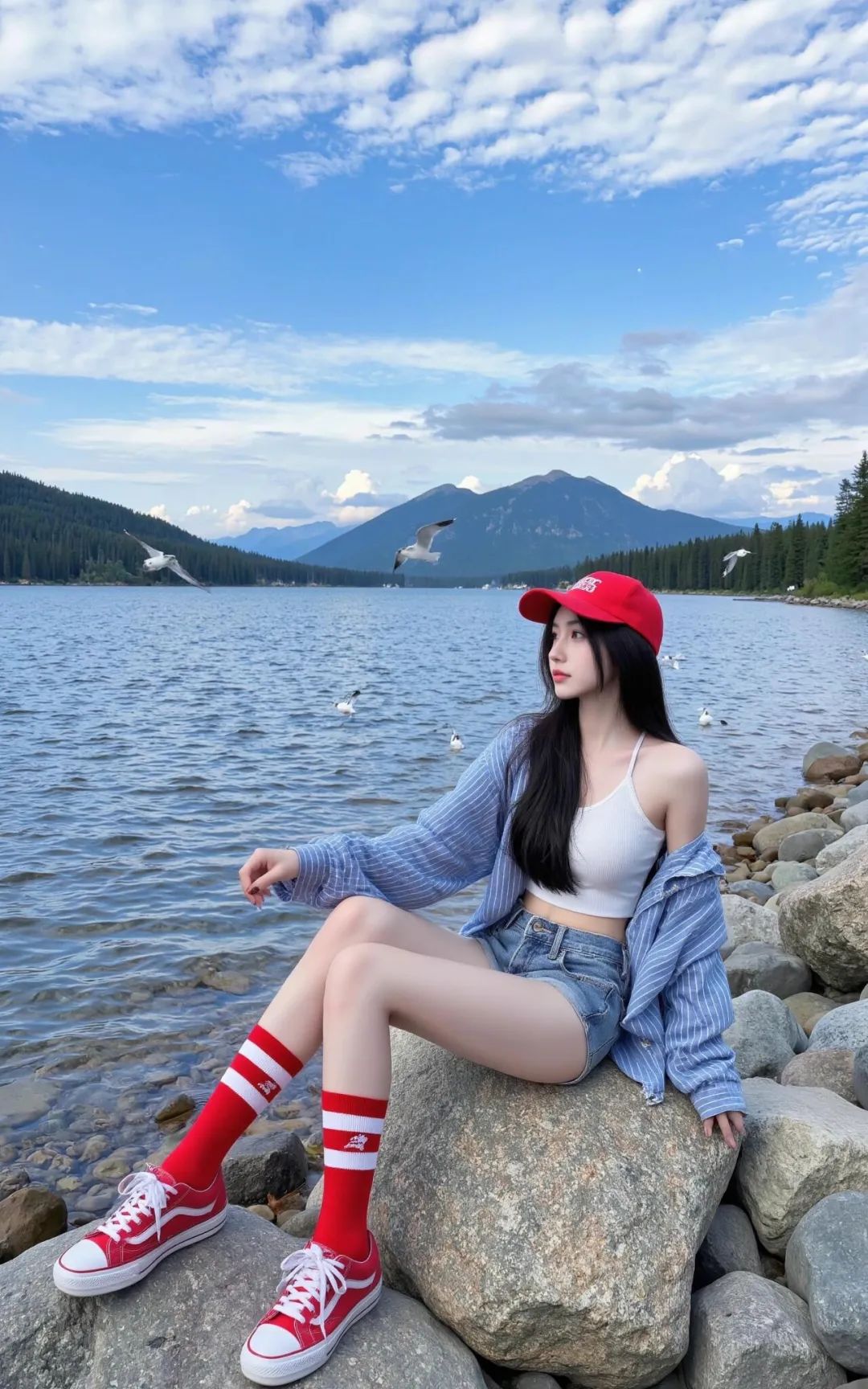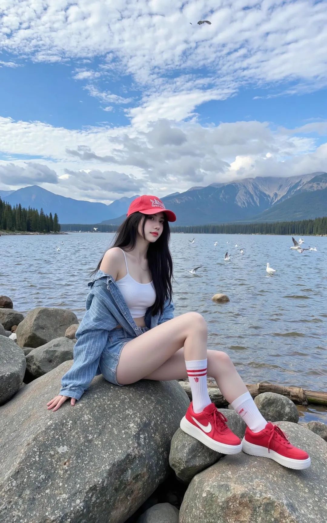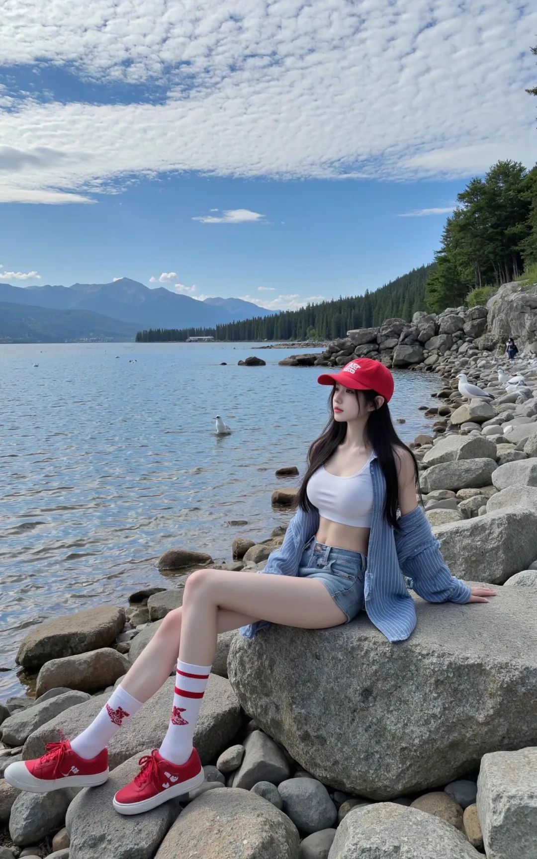 侧身坐在石头上,微微低头,侧目似在聆听湖水的声音,头发自然垂下,遮住一部分脸庞,这个姿势为照片画面增添了一丝神秘感。
