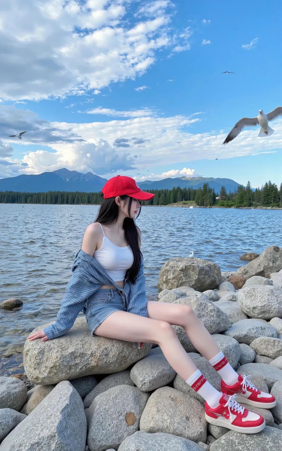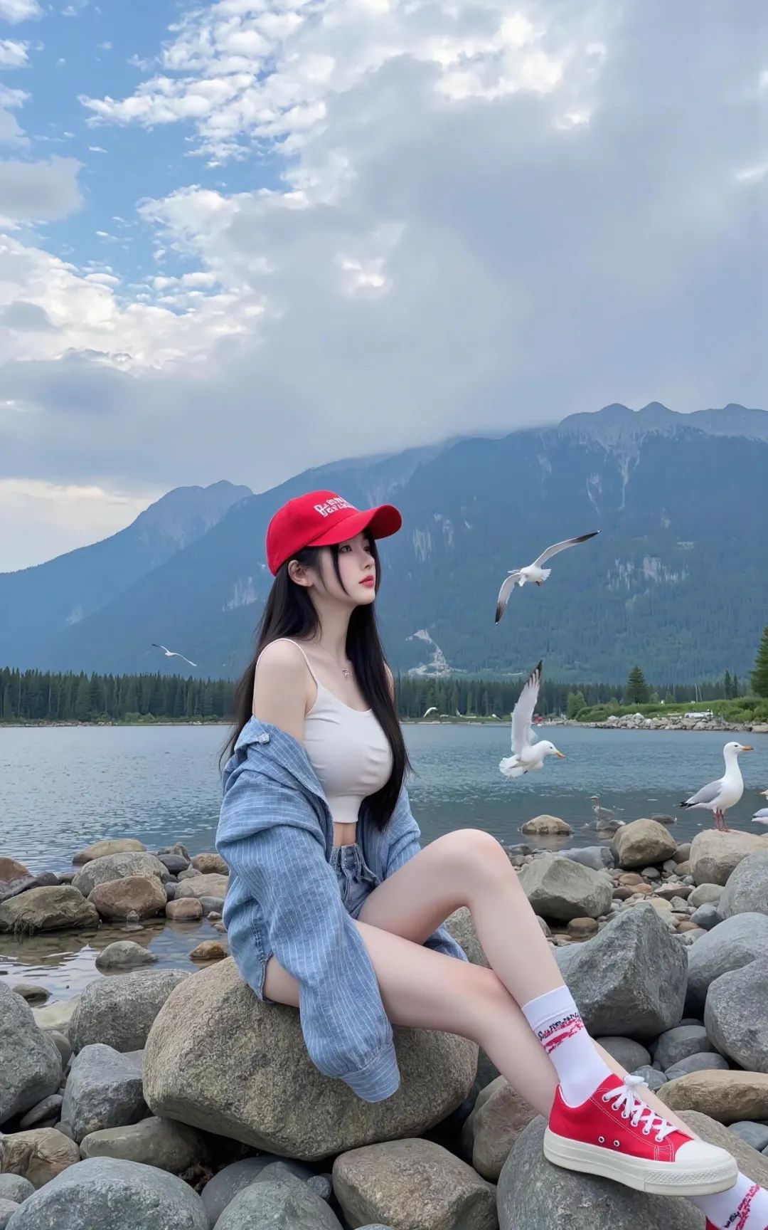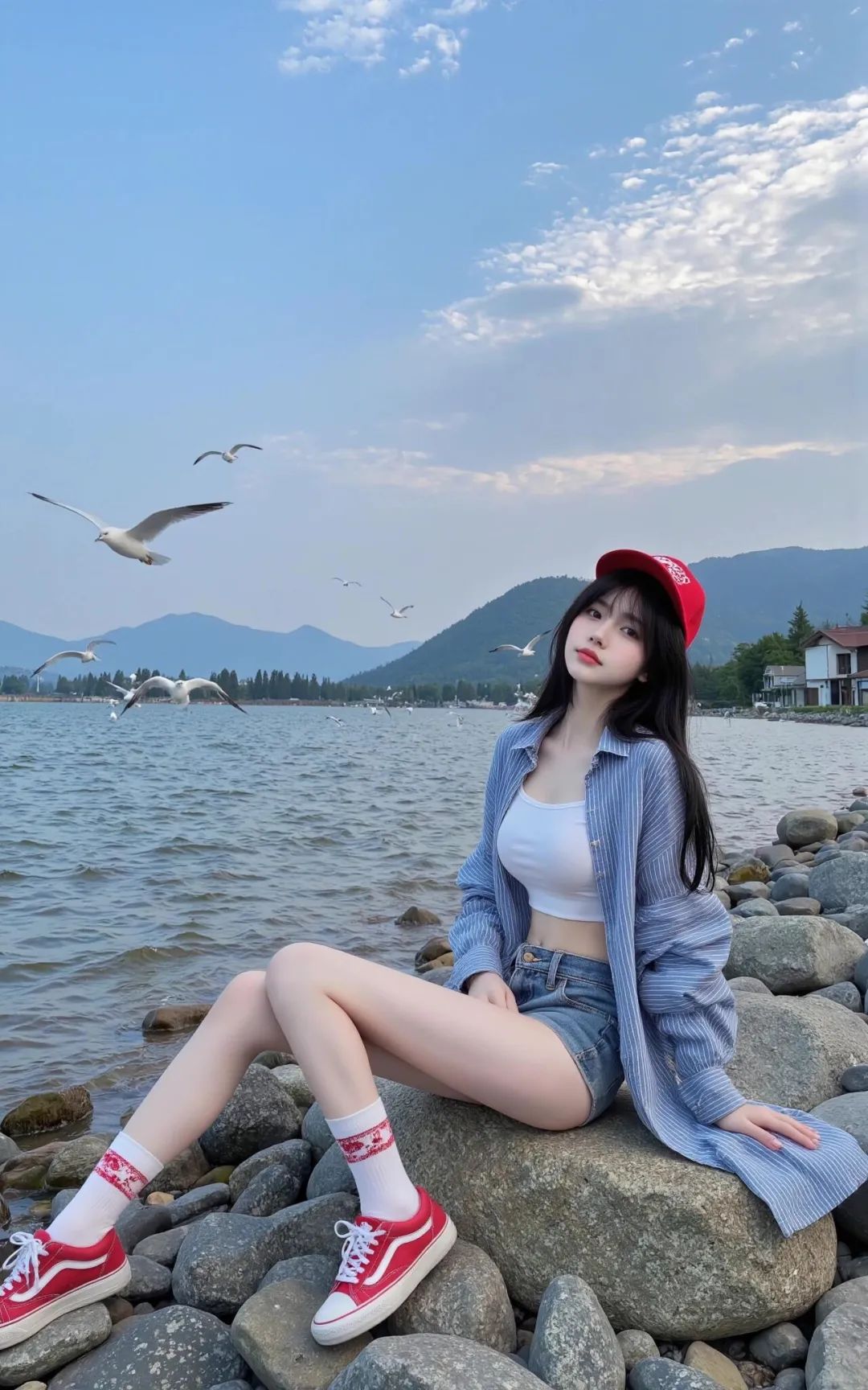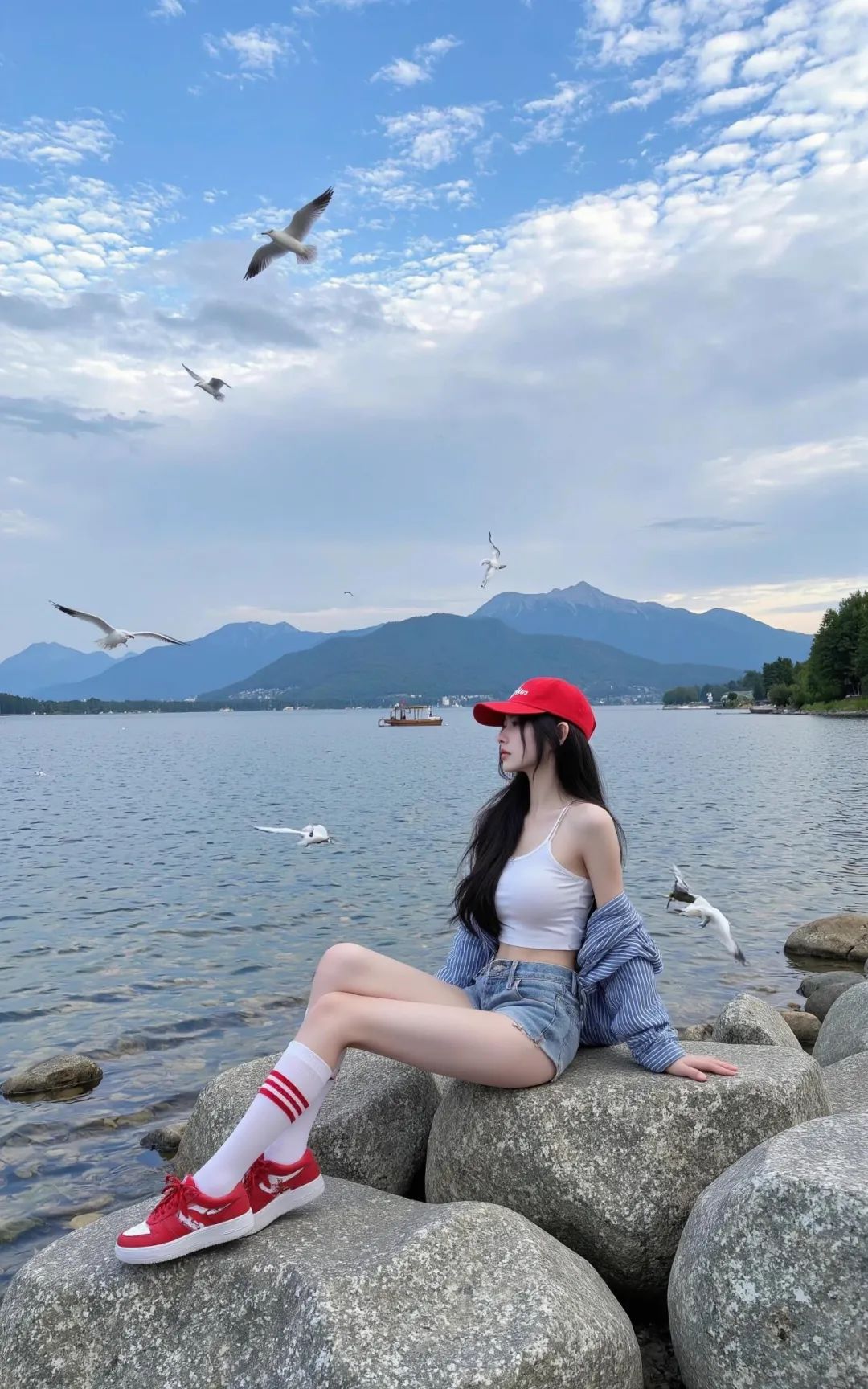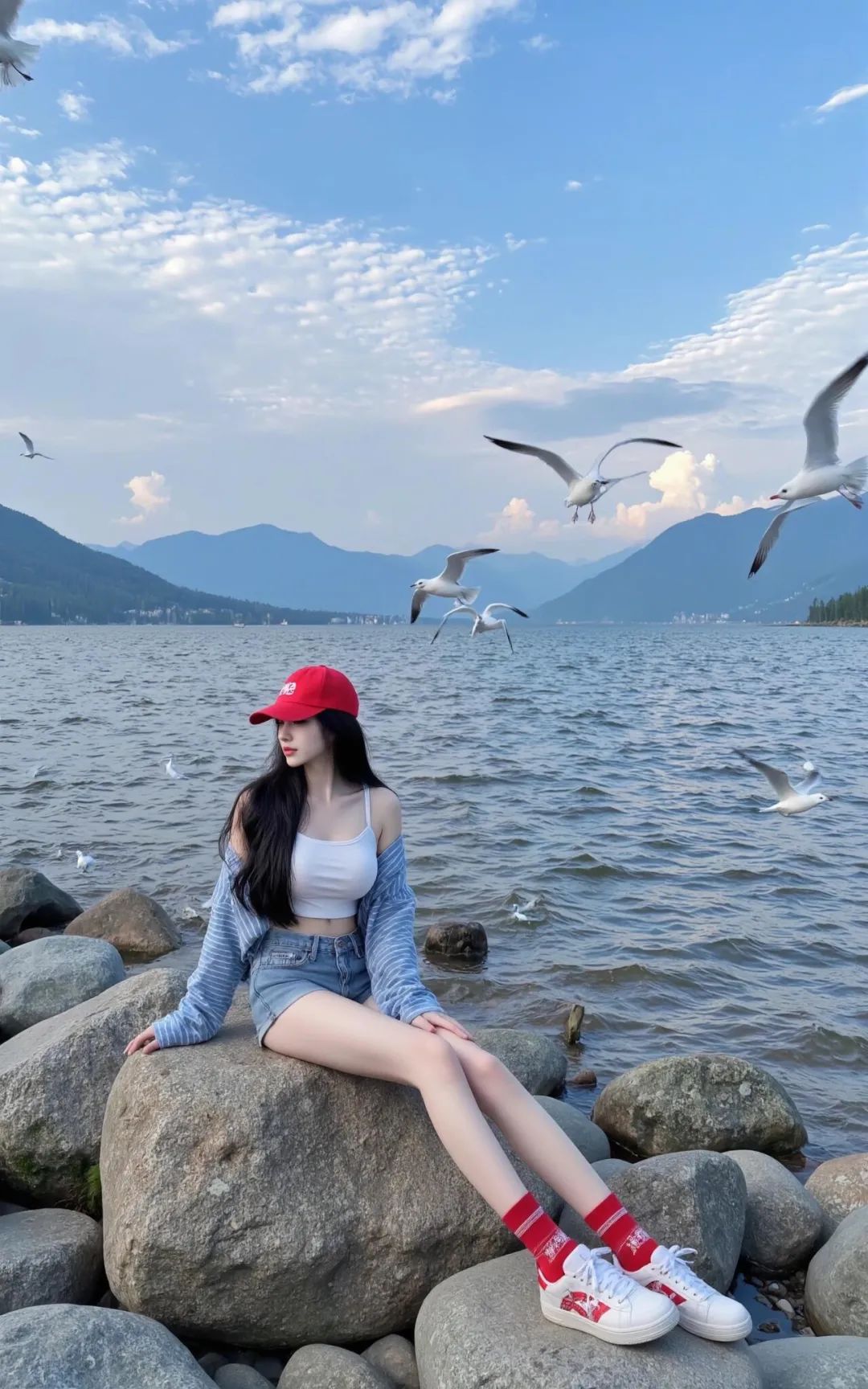 侧身静静地坐在石头上,一手自然垂落,另一手放在腿上,目光追随着飞翔的海鸥。蓝天白云、青山绿水作为背景,拍出来的照片文艺浪漫,仿佛在等待与大自然的美好邂逅。