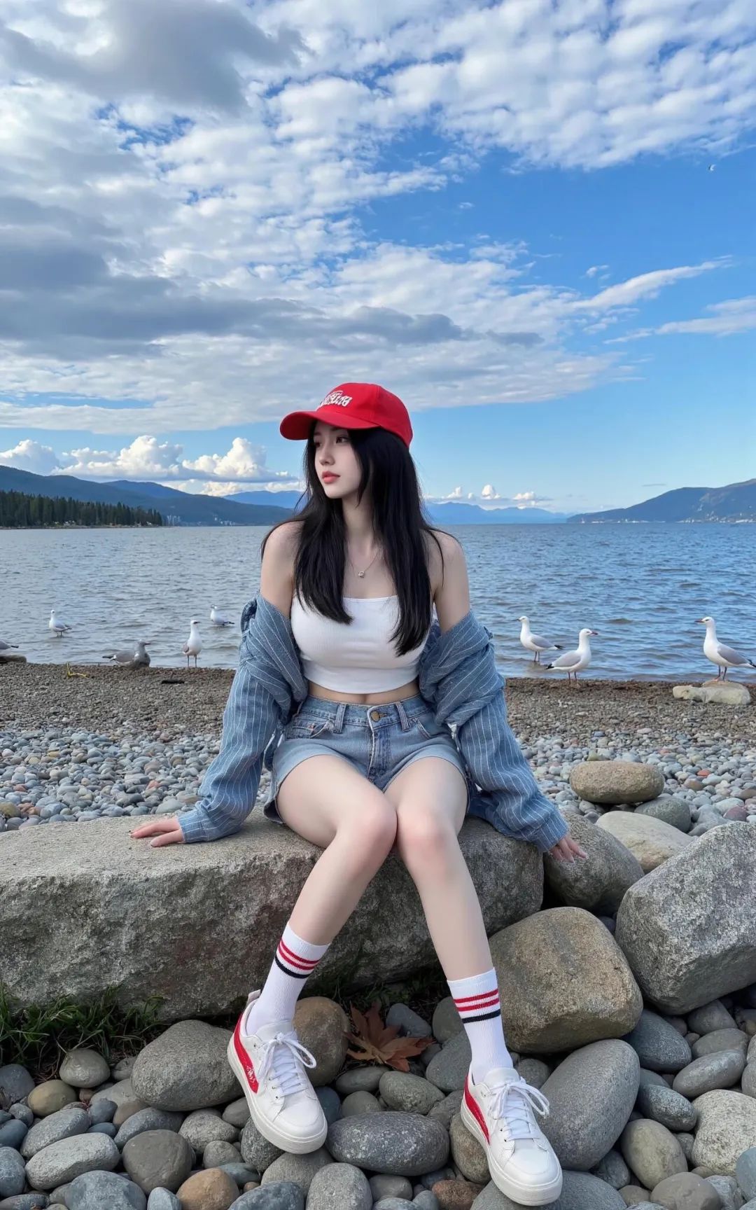 这个姿势依旧是坐在石头上,身体微微后仰,眼神看向天空,表情放松自然。双手放在身后支撑身体,双腿优雅交叠。这样拍出来的照片展现出修长的腿部线条,同时背景中飞翔的海鸥与蓝天白云相衬,拍出来的照片满满的青春活力。