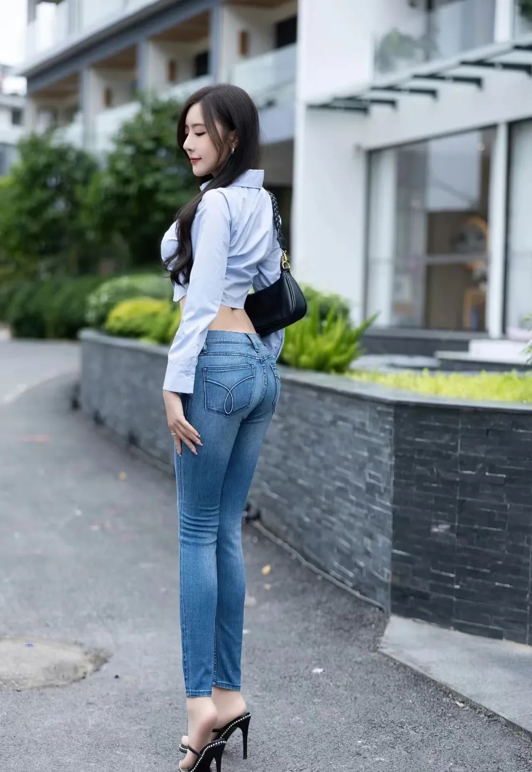 她身穿紧身牛仔裤,搭配衬衫和高跟鞋,身姿唯美妖娆。