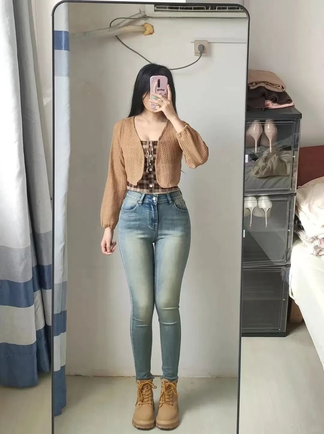 相比瑜伽裤,紧身牛仔裤可以更好的凸显身材,也更适合日常通勤穿着;